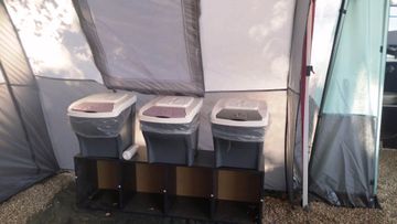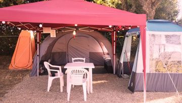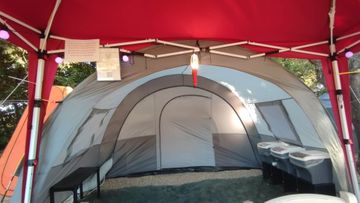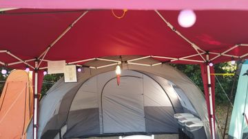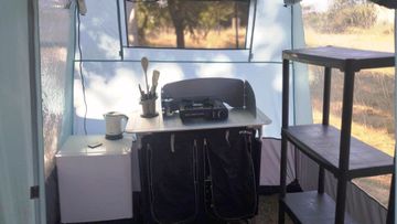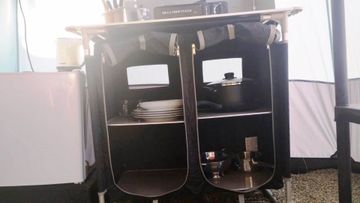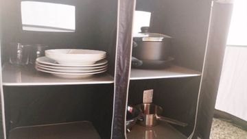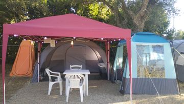 con tavolo e sedie per tutti gli occupanti; gazebo e angolo cottura dotato di cucina a gas GPL, frigorifero, armadietto dove sono presenti pentole, strumenti da cucina e stoviglie per 6 persone. Colonnina per l'acqua potabile nelle immediate vicinanze.